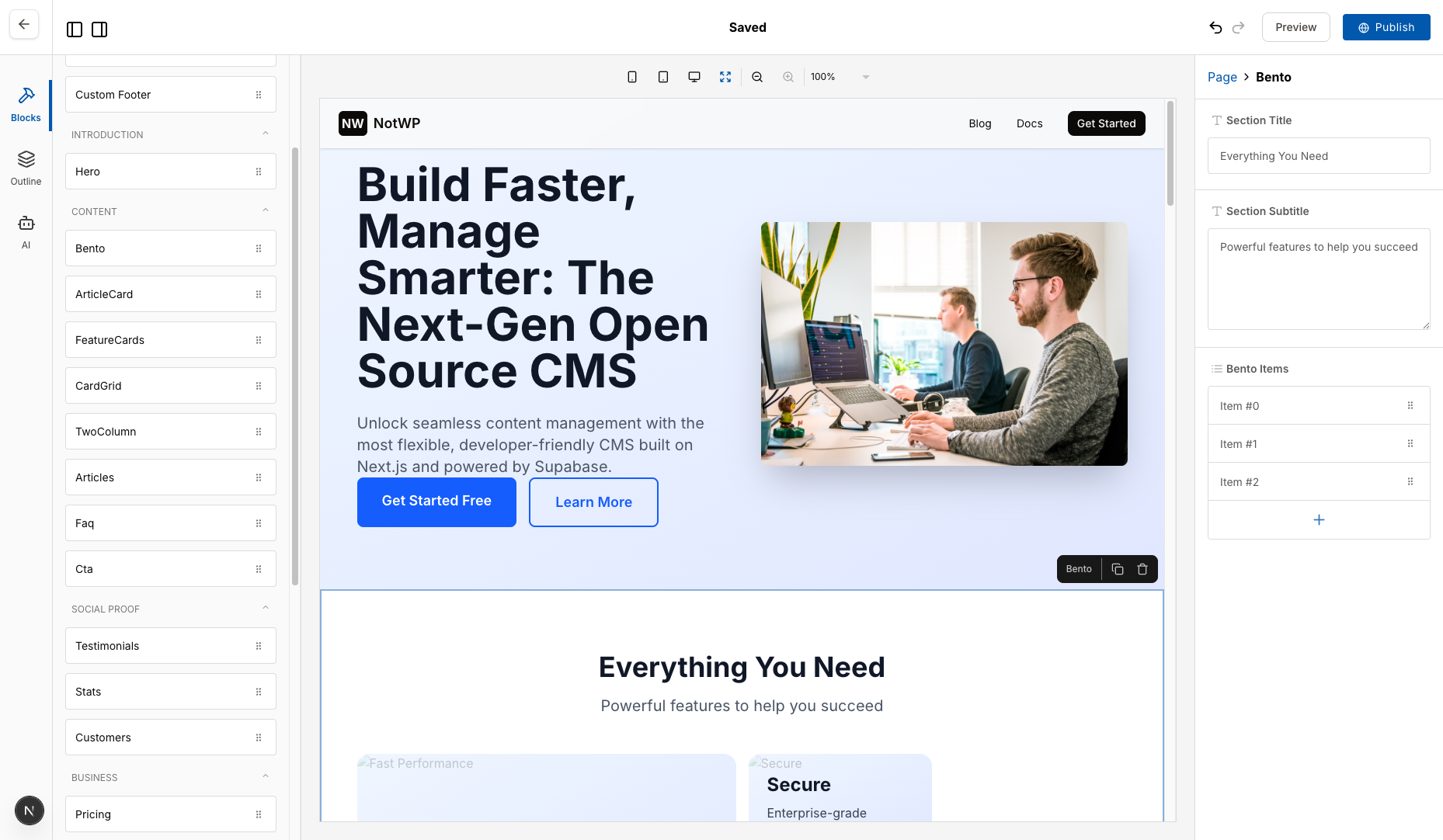 Where WordPress often requires extensive configuration and a careful selection of plugins to achieve optimal performance, NotWP delivers speed and simplicity straight out of the box.